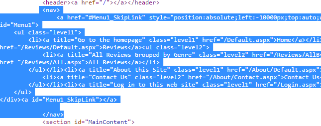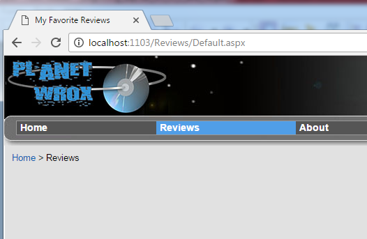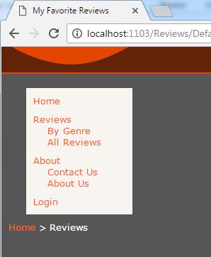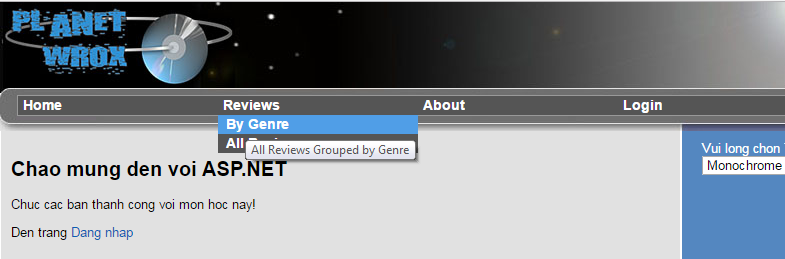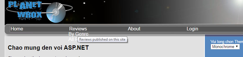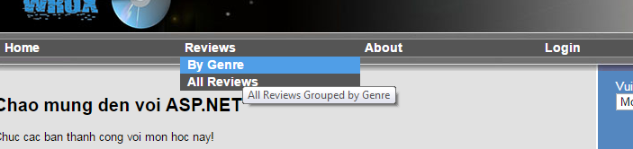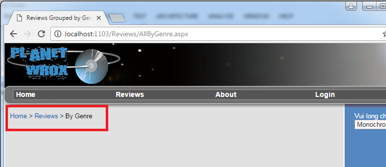 - Lúc này chúng ta vẫn chưa thấy SiteMapPath hiển thị, chọn một mục menu nào đó, ví dụ chọn Reviews và chọn By Genre, kết quả: