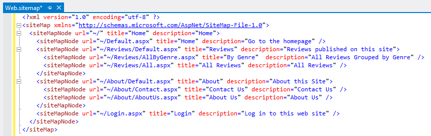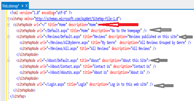 - Xem lại tập tin Web.sitemap chúng ta thấy rằng chúng ta sẽ có một menu duy nhất là Home. Trong Home có các menu con là Home, Reviews, About, Login. Trong menu Reviews có hai menu con là By Genre và All Reviews, trong About có hai menu con là Contact Us và About Us: