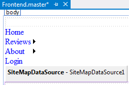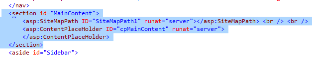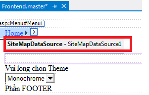 - Mở trang master Frontend.master, thêm SiteMapPath control từ Toolbox mục Navigation vào vị trí <section> có ID là MainContent và trên <asp: ContentPlaceHolder>, lưu ý có thêm hai thẻ <br>: