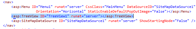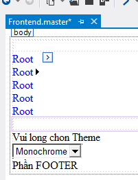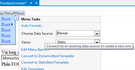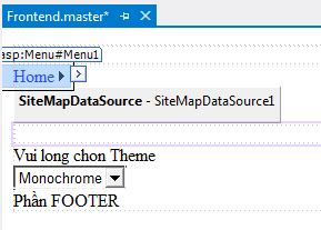 - Mở trang master Frontend.master ở chế độ Resource, kéo TreeView control từ thanh Toolbox trong mục Navigation và thả vào trong phần tử <nav> dưới Menu control: