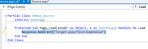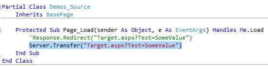- Mở lại trang mã VB của trang Source.aspx (tập tin Source.aspx.vb), đến Page_Load và che dòng code trước đó (dùng phương thức Redirect) thay bằng dòng mã mới (dùng phương thức Transfer):