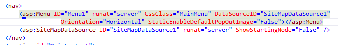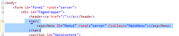 - Trong thanh Toolbox tìm mục Navigation và tìm đến Menu kéo Menu thả vào giữa cặp thẻ <nav> và thiết lập thuộc tính CssClass đến MainMenu: