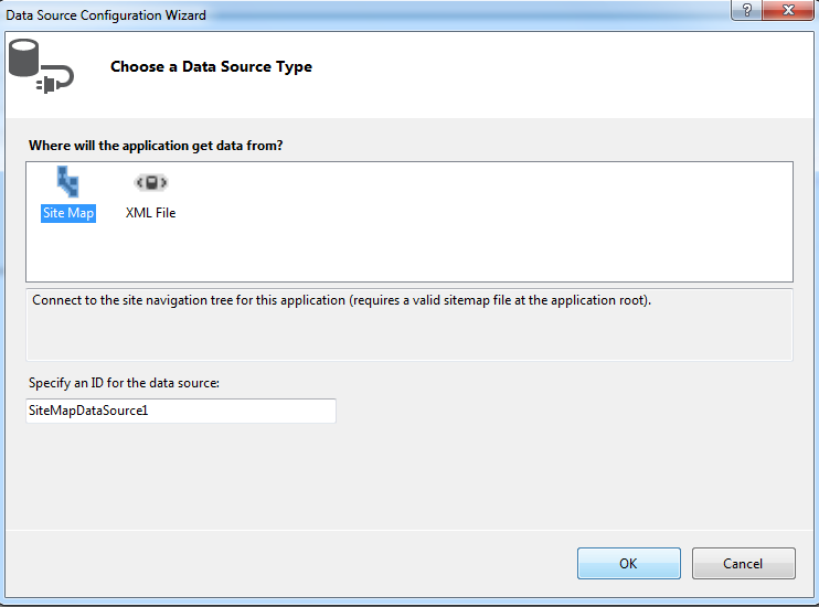 - Chọn <New data source> từ mục Choose Data Source và chọn biểu tượng SiteMap từ hộp thoại Data Source Configuration Wizard hiện ra sau đó và OK: