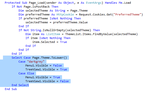 - Đoạn mã trên thể hiện rằng, khi ta chọn theme DarkGrey thì Menu control sẽ ẩn và TreeView sẽ hiển thị và ngược lại khi chọn theme Monochrome.