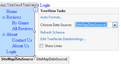 - Chuyển trang master sang chế độ Design, nhấp chuột vào mũi tên bên phải của TreeView để mở thanh Smart Tasks. Từ Choose Data Source chọn SiteMapDataSource1, là data source được tạo cho Menu control: