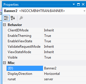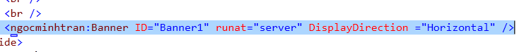 - Mở trang master Frontend.master ở chế độ Source, chọn <ngocminhtran:Banner> và sau thuộc tính runat thêm thuộc tính DisplayDirection (đã tạo ở trên) với giá trị là Horizontal: