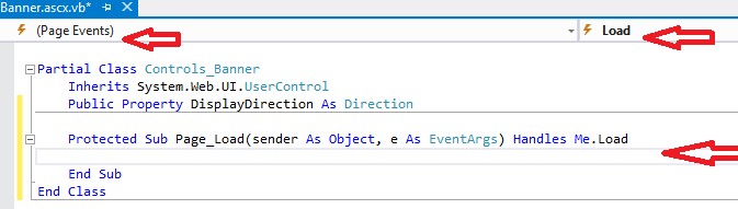 - Trở lại file Banner.ascx.vb, chọn Page Events từ cửa sổ bên trái và Load cửa sổ bên phải để đến sự kiện Load: