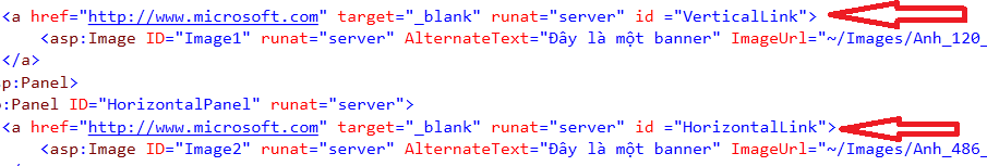 - Chuyển đến file Banner.ascx ở chế độ Source, thêm thuộc tính runat và các id cho các liên kết (thẻ a) như sau: