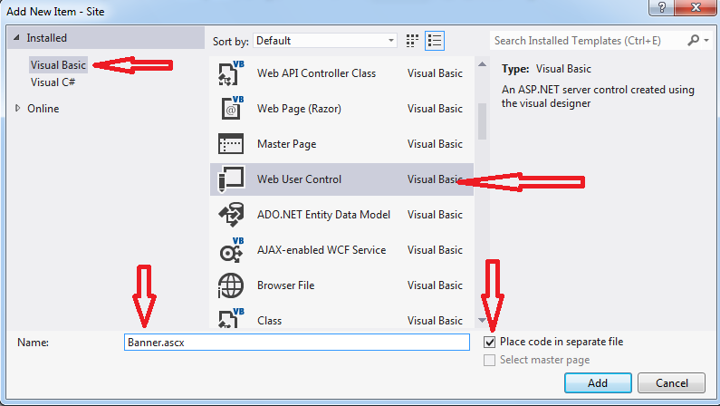 - Thêm một user control vào thư mục Controls (đã tạo từ các chương trước, nếu chưa thì tạo ra) bằng cách nhấp chuột phải Controls chọn Add > New Item và chọn Web User Control, đặt tên file là Banner với phần mở rộng mặc định là ascx và chú ý các tuỳ chọn:
