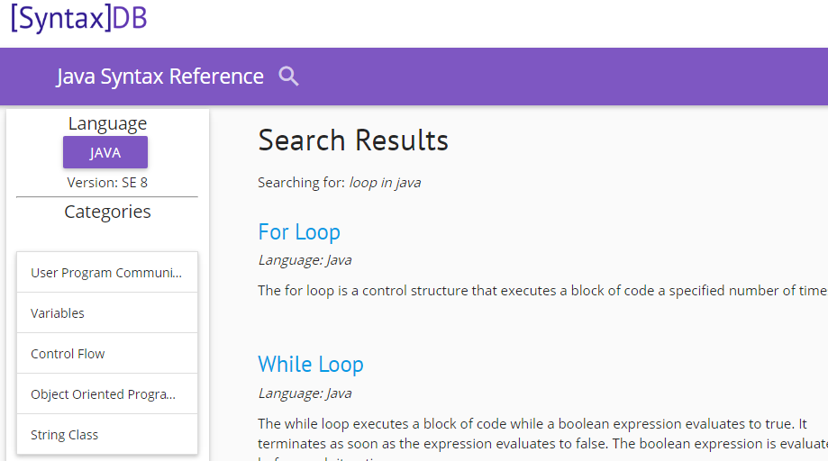 Gõ một vài từ khoá, ví dụ loop in java, kết quả:
