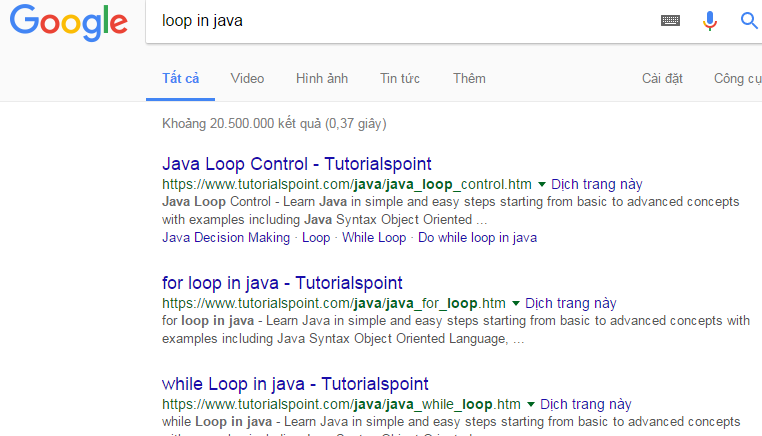 Kết quả tìm kiếm sẽ tham chiếu trực tiếp đến thông tin về vòng lặp trong java, thay vì thông tin rất rộng như các công cụ tìm kiếm khác, như Google: