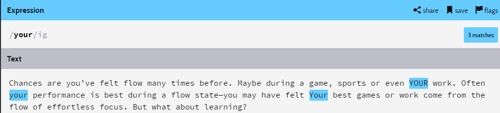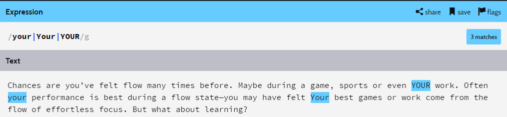 Ví dụ trong ngôn ngữ Perl, Java, hay PCRE chúng ta có thể dùng (?i)your sẽ cho kết quả so khớp tương tự với việc dùng dấu | hay chọn tuỳ chọn ignore case (i). Ví dụ trong Regex Pal (regexpal.com) chọn PCRE: