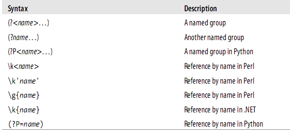 Chúng ta có thể tạo nhóm theo tên và tham chiếu đến nhóm thông qua tên. Danh sách sau mô tả cú pháp nhóm theo tên trong các ngôn ngữ: