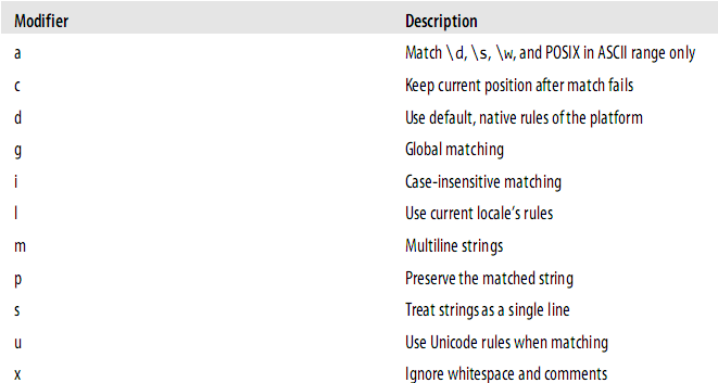 RegExr chỉ hỗ trợ 3 tuỳ chọn trong flags là global (g), ignore case (i), và multiline (m). Tuy nhiên, trong một số ngôn ngữ lập trình như Perl, có nhiều tuỳ chọn hơn như bảng dưới đây: