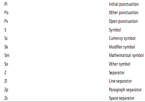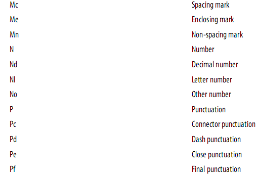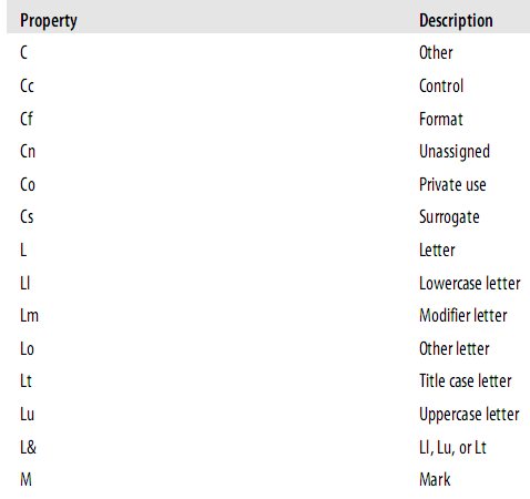 - \P{property} không so khớp các kí tự có thuộc tính property.