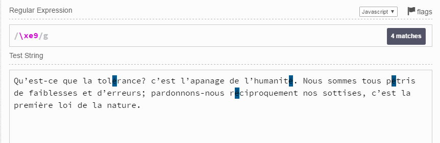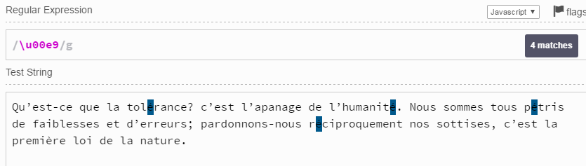 Mở lại Regex Pal (regexpal.com), gõ \u00e9 trên ô Regular Expression, copy đoạn văn bản mẫu ở trên và dán vào ô Test String, kết quả: