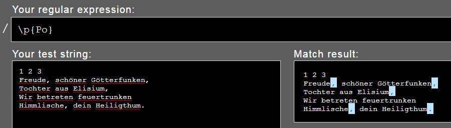 Gõ \p{Po} dùng để so khớp các dấu câu (như phẩy, chấm, v.v.):