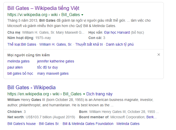 Giả sử chúng ta muốn biết thông tin tiểu sử của Bill Gates, nếu tìm kiếm Google sẽ có hai phiên bản tiếng Việt và tiếng Anh: