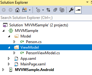 Để dễ hình dung, chúng ta sẽ tạo một ứng dụng đơn giản tên MVVMSample. Tiếp theo, chúng ta sẽ tạo một thư mục tên Model trong dự án MVVMSample (giả sử chúng ta có hai dự án MVVMSample và MVVMSample.Android) và thêm một lớp tên Person.cs đến thư mục này