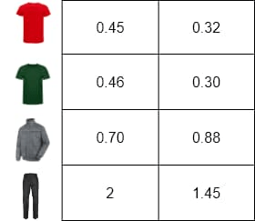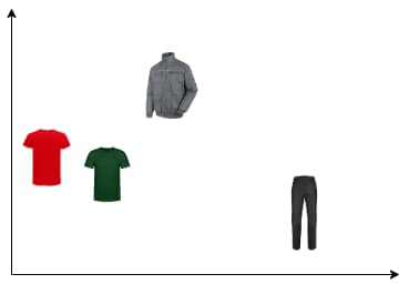 Trong Hình 6, chúng ta có thể thấy biểu diễn chiều của các đối tượng này để minh họa sự tương đồng của chúng. Áo thun gần nhau vì cả hai là cùng một sản phẩm nhưng có màu sắc khác nhau. Áo khoác gần áo thun vì chúng có các thuộc tính chung như tay áo và cổ áo. Ở phía bên phải nhất là quần jeans không chia sẻ thuộc tính với các sản phẩm khác.